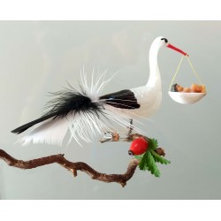 In den Märchen ist der Storch der Vogel, der die Kinder in die Welt bringt. Das Baby ist in ein Keramikschiffchen gebettet und ist ebenfalls in Handarbeit aus Wachs gegossen. Mit der goldenen Metallklammer läßt er sich leicht an einem Zweig befestigen. Der Klapperstorch ist mit Schmuckfeder ca. 13cm lang, der Glaskörper alleine hat eine Länge von etwa 7,5cm.
