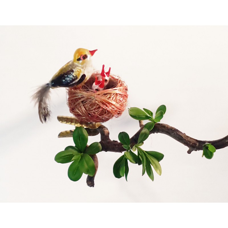 Das Nest der Pirolfamilie besteht aus gefärbten natürlichen Sisal und ist ca. 4-5 cm groß im Durchmesser und sieht sehr hübsch auf dem Weihnachtsbaum aus. Mit der goldenen Metallklammer läßt es sich leicht an einem Zweig anbringen.